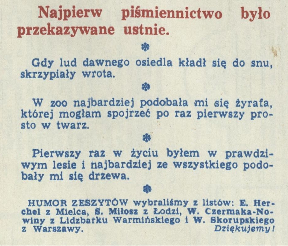 Archiwum / Humor zeszytów szkolnych nr specjalny 39/1993 18698/123969 Podziel się Tytuł [Najpierw piśmiennictwo było przekazywane ustnie] Rubryka Humor zeszytów szkolnych Artykuł z numeru nr specjalny 39/1993 Data wydania 26 września 1993 Tagi humor zeszytów szkolnych rozmaitości