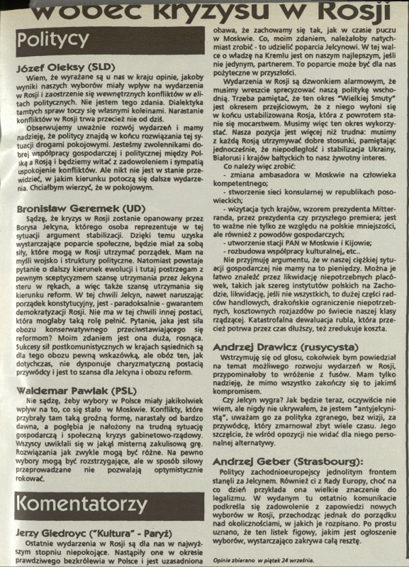 Archiwum / Opinie nr 2519 (40/1993) 1/2 Podziel się Tytuł Wobec kryzysu w Rosji Kategoria Opinie Artykuł z numeru 2519 (40/1993) Data wydania 3 października 1993 Tagi kryzys w Rosji komentarze politycy