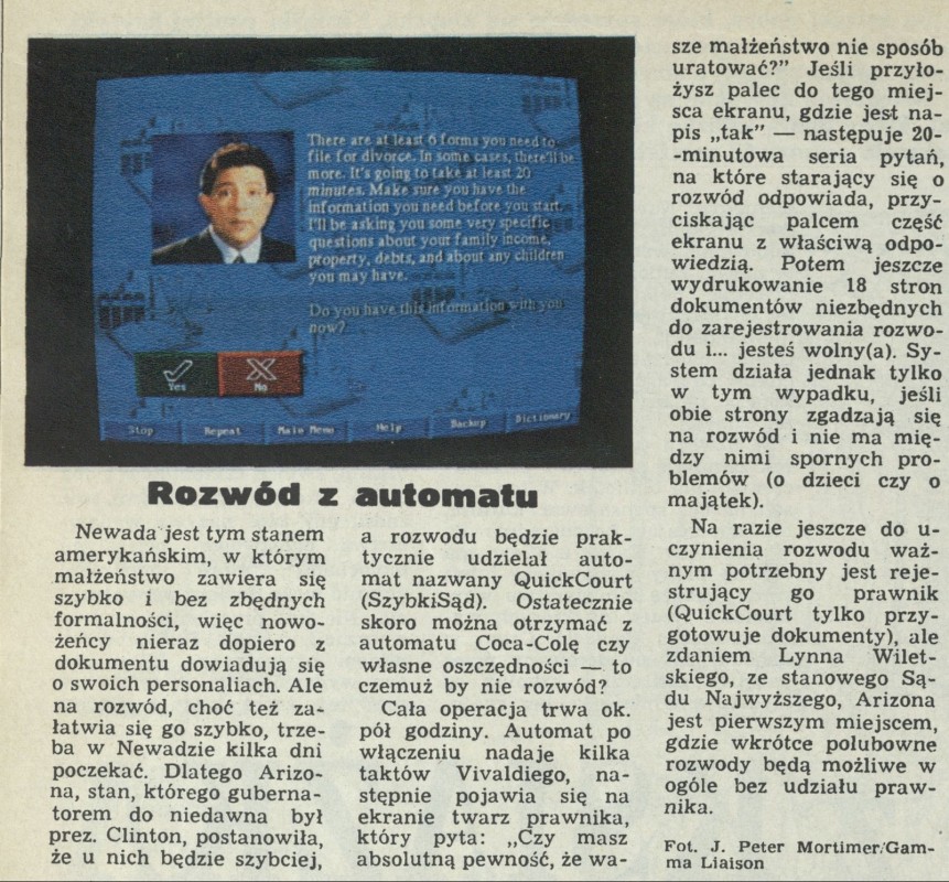 Archiwum / Różności nr 2519 (40/1993) 2/2 Podziel się Tytuł Rozwód z automatu Kategoria Różności Artykuł z numeru 2519 (40/1993) Data wydania 3 października 1993 Tagi automatyczny rozwód Stany Zjednoczone
