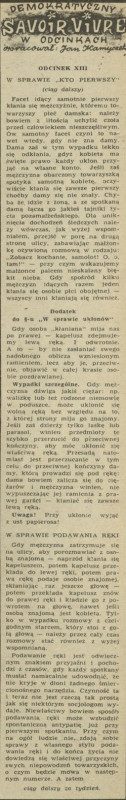 Archiwum / Demokratyczny savoir-vivre nr 112 (22/1947) 12/1625 Podziel się Tytuł Odcinek XIII W sprawie „kto pierwszy” Autor Jan Kamyczek Rubryka Demokratyczny savoir-vivre Artykuł z numeru 112 (22/1947) Data wydania 1 czerwca 1947 Tagi dobre wychowanie kultura obyczaje bon-ton