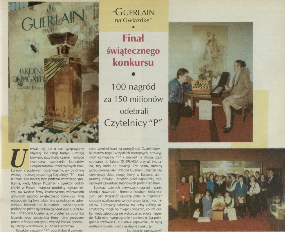 Archiwum / Konkurs nr specjalny 11/1994 14/18 Podziel się Tytuł Guerlain na Gwiazdkę. Finał świątecznego konkursu Rubryka Konkurs Artykuł z numeru nr specjalny 11/1994 Data wydania 13 marca 1994 Tagi konkurs rozwiązanie perfumy Guerlain