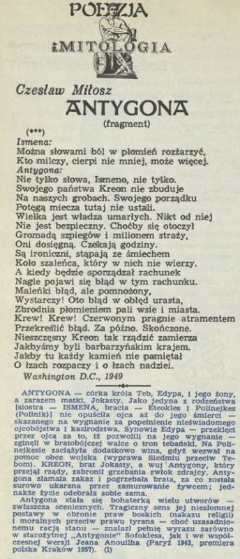 Archiwum / Poezja nr 2526 (47/1993) 41/67 Podziel się Tytuł Poezja i mitologia: Antygona (fragment) Autor Czesław Miłosz Kategoria Poezja Artykuł z numeru 2526 (47/1993) Data wydania 21 listopada 1993 Tagi Czesław Miłosz Antygona