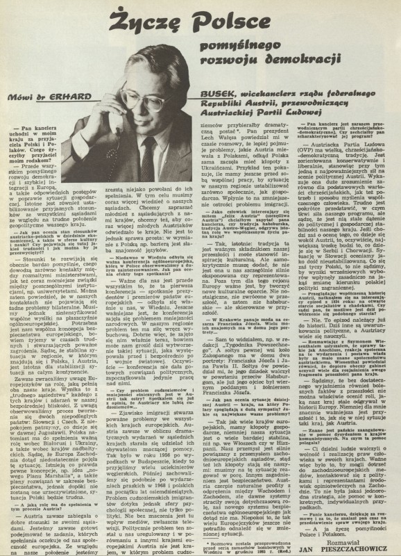 Archiwum / Wywiad nr 2532 (01/1994) 105948/123969 Podziel się Tytuł Życzę Polsce pomyślnego rozwoju demokracji Autor Jan Pieszczachowicz Kategoria Wywiad Artykuł z numeru 2532 (1/1994) Data wydania 2 stycznia 1994 Tagi Erhard Rusek Austria demokracja