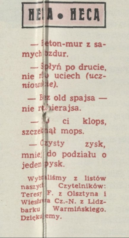 Archiwum / Heca hecą nr 2533 (02/1994) 17933/123969 Podziel się Tytuł Heca hecą Rubryka Heca hecą Artykuł z numeru 2533 (2/1994) Data wydania 9 stycznia 1994