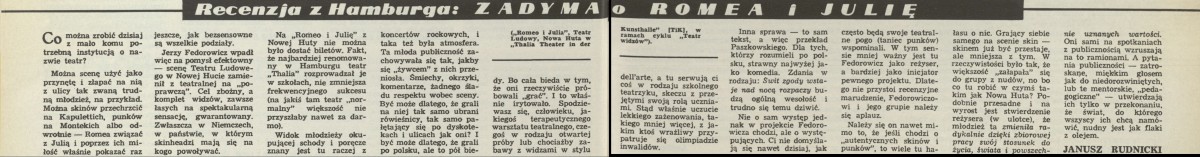Archiwum / Relacja nr 2534 (03/1994) 131/1986 Podziel się Tytuł Zadyma o Romea i Julię Autor Janusz Rudnicki Kategoria Relacja Artykuł z numeru 2534 (3/1994) Data wydania 16 stycznia 1994 Tagi Hamburg Szekspir "Romeo i Julia" Teatr Ludowy Nowa Huta