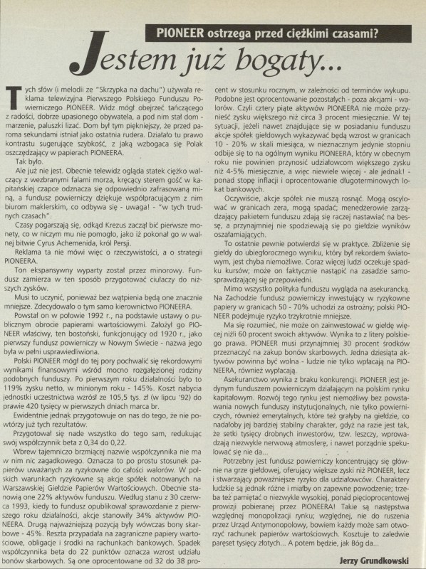 Archiwum / Felieton nr specjalny 14/1994 17236/123969 Podziel się Tytuł Jestem już bogaty... Autor Jerzy Grundkowski Kategoria Felieton Artykuł z numeru nr specjalny 14/1994 Data wydania 3 kwietnia 1994 Tagi Fundusz Powierniczy PIONEER finanse