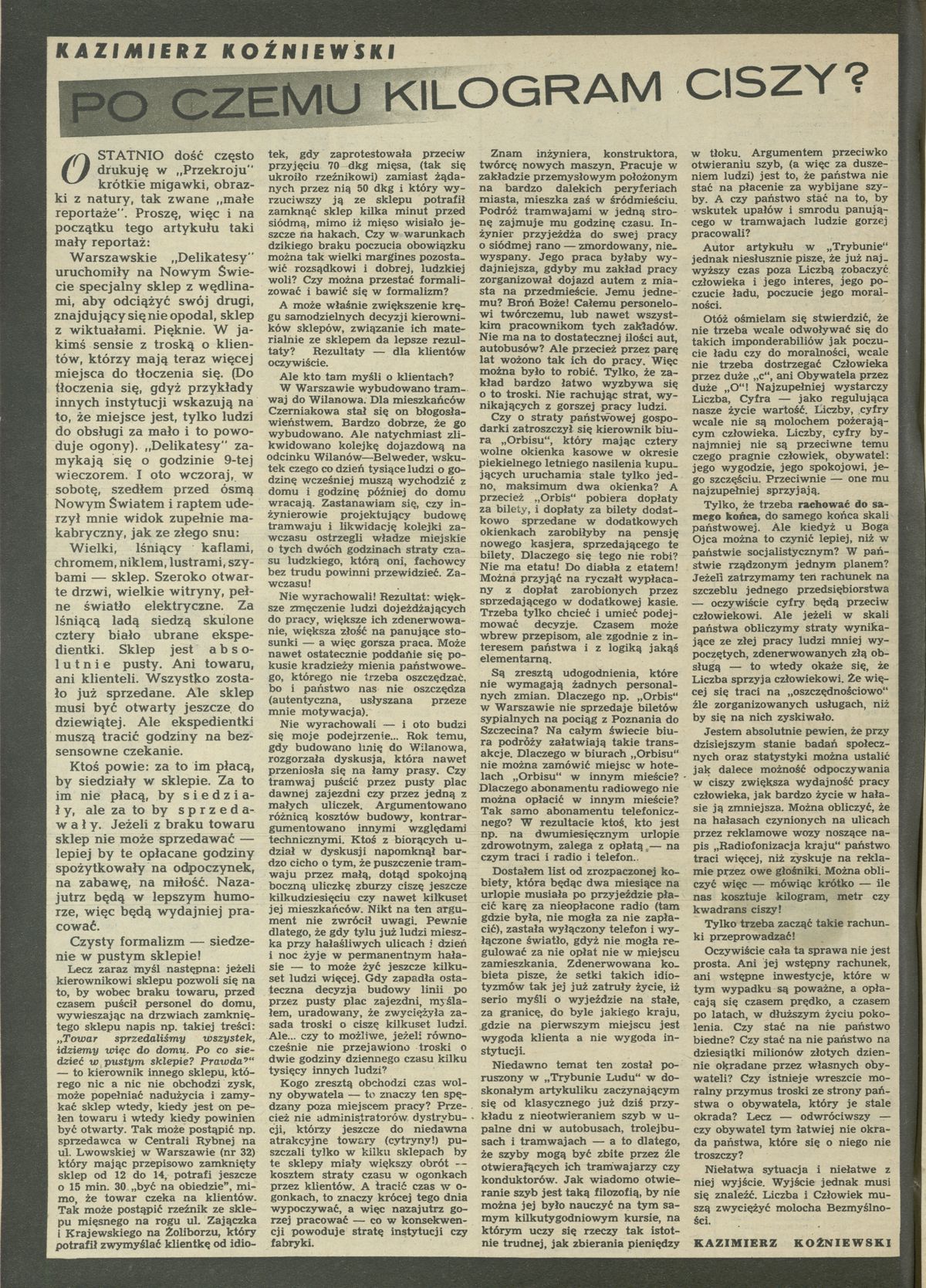 Archiwum / Felieton nr 648 (37/1957) 41/326 Podziel się Tytuł Po czemu kilogram ciszy? Autor Kazimierz Koźniewski Kategoria Felieton Artykuł z numeru 648 (37/1957) Data wydania 8 września 1957 Tagi socjalizm gospodarka praca straty