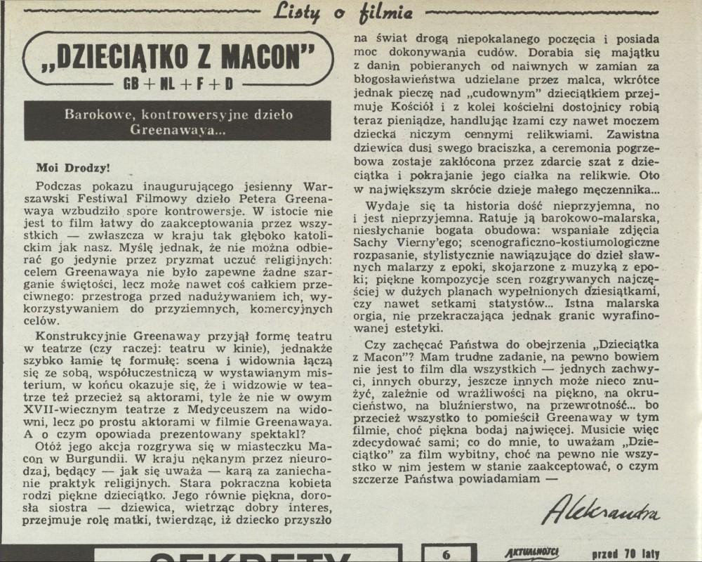 Archiwum / Listy o filmie nr 2537 (06/1994) 106267/123969 Podziel się Tytuł Listy o filmie Autor Aleksandra Rubryka Listy o filmie Artykuł z numeru 2537 (6/1994) Data wydania 6 lutego 1994 Tagi Dzieciątko z Macon Greenway