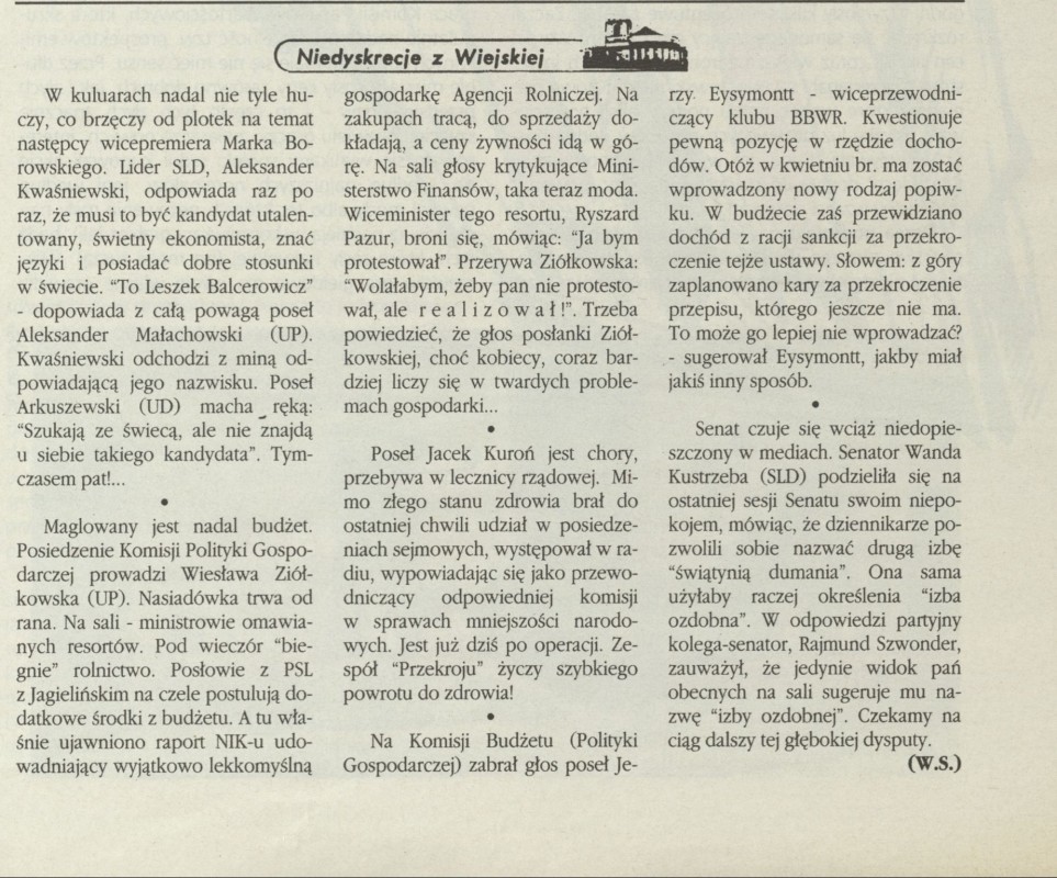 Archiwum / Społeczeństwo nr 2539 (08/1994) 11/14 Podziel się Tytuł Niedyskrecje z Wiejskiej Autor W.S. Kategoria Społeczeństwo Artykuł z numeru 2539 (8/1994) Data wydania 20 lutego 1994 Tagi rząd sejm Wiejska