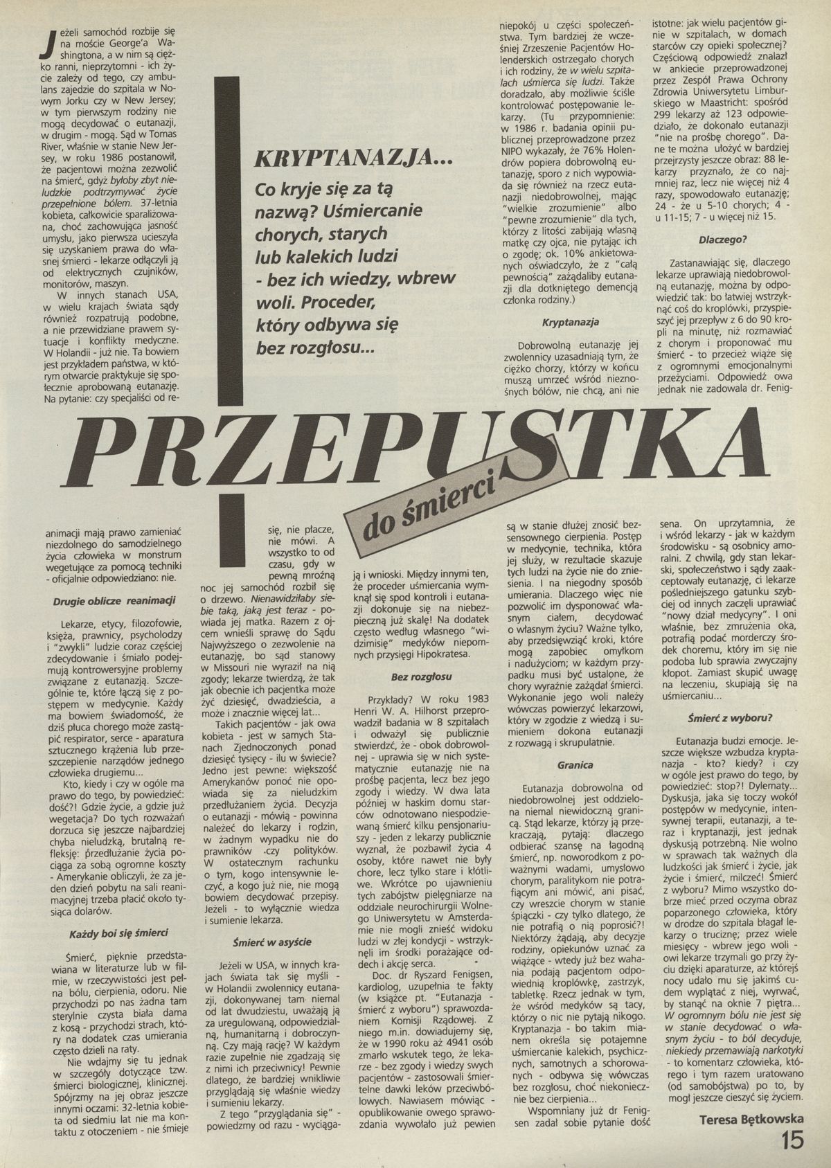 Archiwum / Społeczeństwo nr 2547 (16/1994) 105/122 Podziel się Tytuł Przepustka do śmierci Autor Teresa Bętkowska Kategoria Społeczeństwo Artykuł z numeru 2547 (16/1994) Data wydania 17 kwietnia 1994 Tagi kryptanazja śmierć choroba