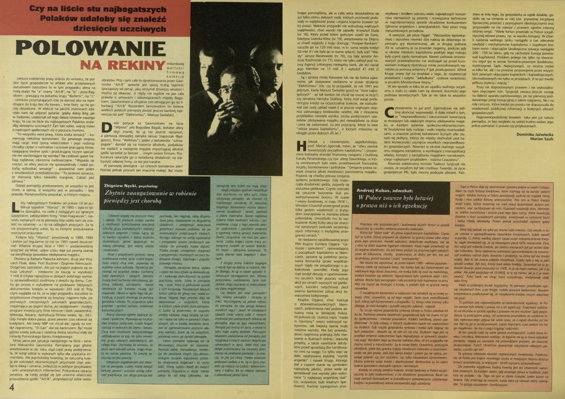 Archiwum / Artykuł nr specjalny 18/1994 12/28 Podziel się Tytuł Polowanie na rekiny Autor Dominika Jaźwiecka, Marian Szulc Kategoria Artykuł Artykuł z numeru nr specjalny 18/1994 Data wydania 1 maja 1994 Tagi najbogatsi Polacy pieniądze uczciwość