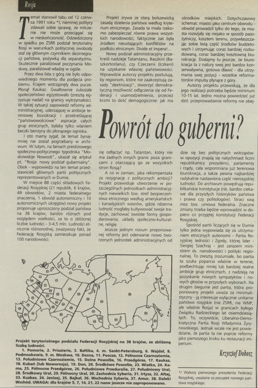 Archiwum / Artykuł nr specjalny 18/1994 106928/123969 Podziel się Tytuł Powrót do guberni? Autor Krzysztof Dobosz Kategoria Artykuł Artykuł z numeru nr specjalny 18/1994 Data wydania 1 maja 1994 Tagi Rosja podział terytorialny gubernie