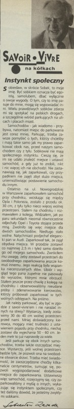 Archiwum / Społeczeństwo nr specjalny 18/1994 18/29 Podziel się Tytuł Savoir-vivre na kółkach. Instynkt społeczny Autor Sobiesław Zasada Kategoria Społeczeństwo Artykuł z numeru nr specjalny 18/1994 Data wydania 1 maja 1994 Tagi savoir-vivre uprzejmość na drodze prowadzenie samochodu