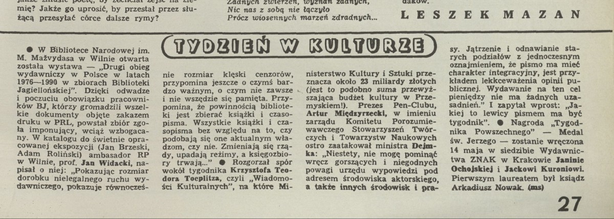 Archiwum / Tydzień w kulturze nr 2550 (19/1994) 3/9 Podziel się Tytuł Tydzień w kulturze Autor ms Rubryka Tydzień w kulturze Artykuł z numeru 2550 (19/1994) Data wydania 8 maja 1994 Tagi Artur Międzyrzecki ZNAK Jacek Kuroń