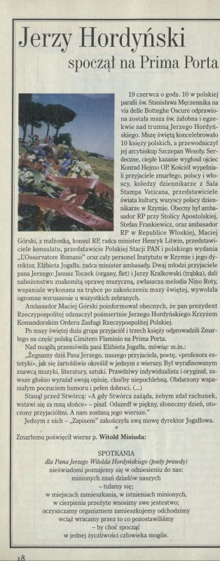Archiwum nr 2768 (27/1998) 171/172 Podziel się Tytuł Jerzy Hordyński spoczął na Prima Porta Artykuł z numeru 2768 (2769/1998) Data wydania 12 lipca 1998 Tagi pożegnanie
