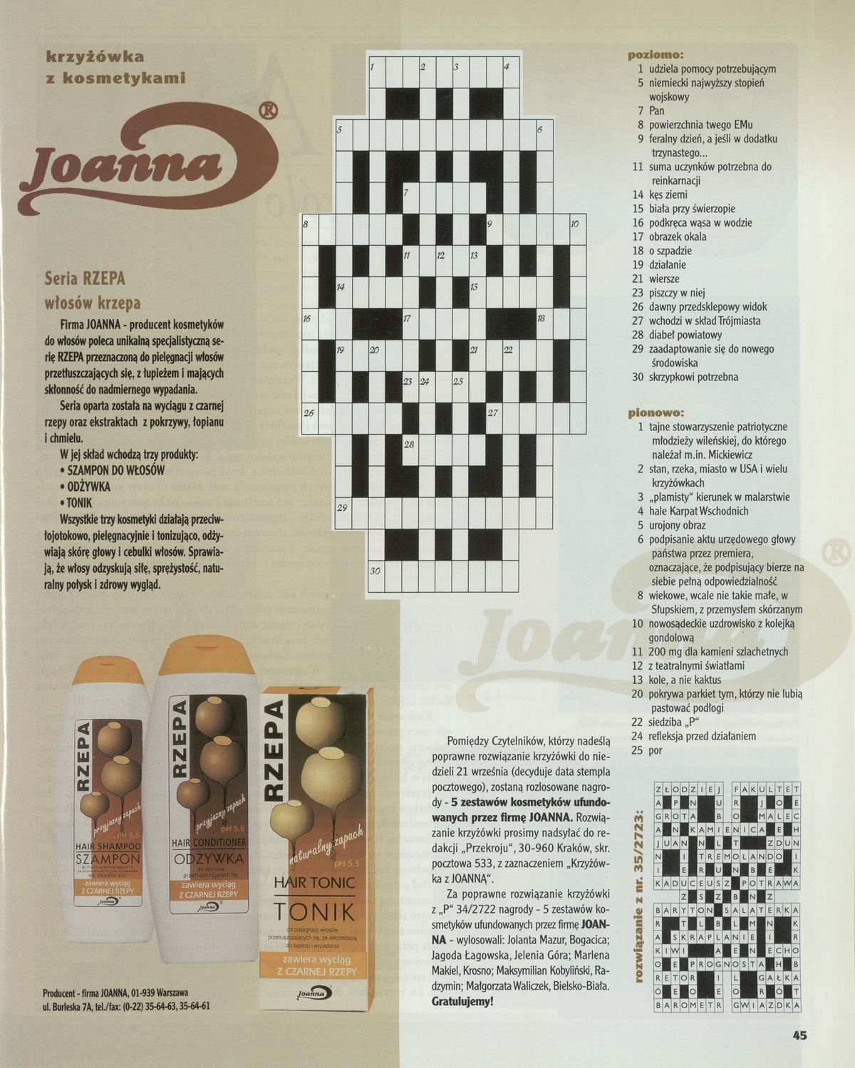 Archiwum / Krzyżówka nr 2725 (37/1997) 116810/123969 Podziel się Tytuł Krzyżówka z kosmetykami Rubryka Krzyżówka Artykuł z numeru 2725 (37/1997) Data wydania 14 września 1997 Tagi Joanna rzepa