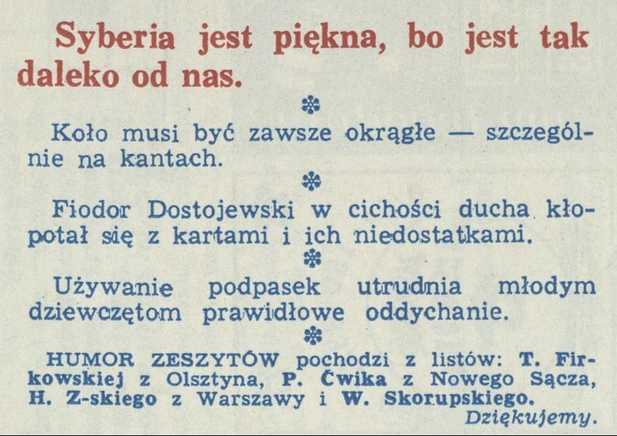 Archiwum / Humor zeszytów szkolnych nr specjalny 22/1994 25/44 Podziel się Tytuł [Syberia jest piękna...] Rubryka Humor zeszytów szkolnych Artykuł z numeru nr specjalny 22/1994 Data wydania 29 maja 1994 Tagi humor zeszytów szkolnych rozmaitości