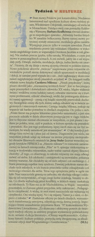 Archiwum / Tydzień w kulturze nr 2727 (39/1997) 116905/123969 Podziel się Tytuł Tydzień w kulturze Rubryka Tydzień w kulturze Artykuł z numeru 2727 (39/1997) Data wydania 28 września 1997