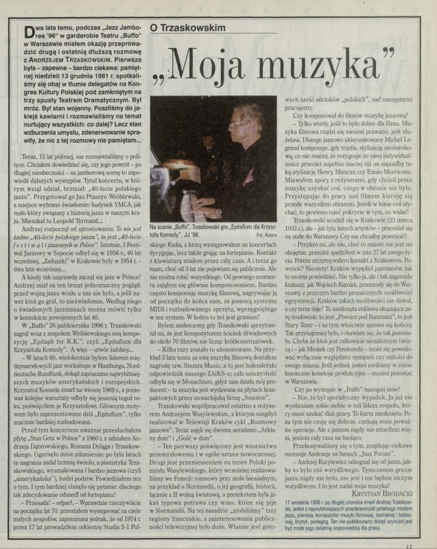 Archiwum / Wywiad nr 2783 (27/1998) 119970/123969 Podziel się Tytuł O Trzaskowskim. „Moja muzyka” Autor Krystian Brodacki Kategoria Wywiad Artykuł z numeru 2783 (2784/1998) Data wydania 25 października 1998 Tagi jazz