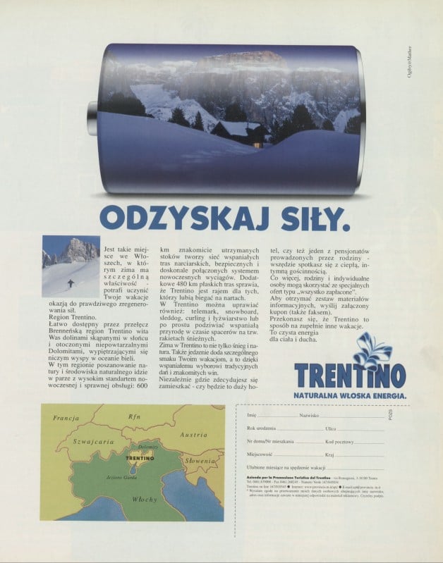 Archiwum / Reklamy nr 2783 (27/1998) 99/101 Podziel się Tytuł Trentino. Naturalna włoska energia Rubryka Reklamy Artykuł z numeru 2783 (2784/1998) Data wydania 25 października 1998