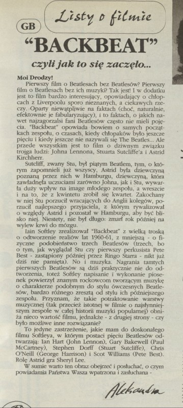 Archiwum / Listy o filmie nr 2559 (28/1994) 107509/123969 Podziel się Tytuł Listy o filmie Autor Aleksandra Rubryka Listy o filmie Artykuł z numeru 2559 (28/1994) Data wydania 10 lipca 1994 Tagi Backbeat film
