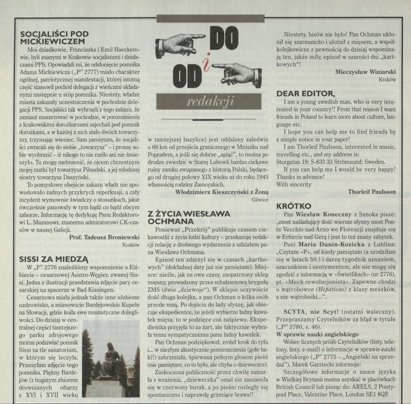 Archiwum / Listy do i od redakcji nr 2783 (27/1998) 09/23 Podziel się Tytuł Listy do i od redakcji Rubryka Listy do i od redakcji Artykuł z numeru 2783 (2784/1998) Data wydania 25 października 1998 Tagi pomnik Adama Mickiewicza Sissi Elżbieta Bawarska Wiesław Ochman