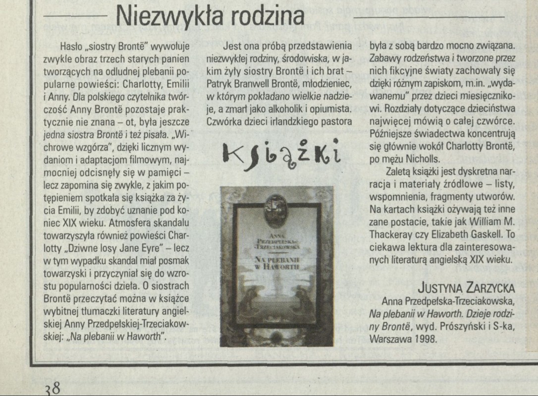 Archiwum / Książki nr 2783 (27/1998) 33/156 Podziel się Tytuł Niezwykła rodzina Autor Justyna Zarzycka Rubryka Książki Artykuł z numeru 2783 (2784/1998) Data wydania 25 października 1998 Tagi "Na plebanii w Haworth. Dzieje rodziny Brontë" Przedpełska-Trzeciakowska