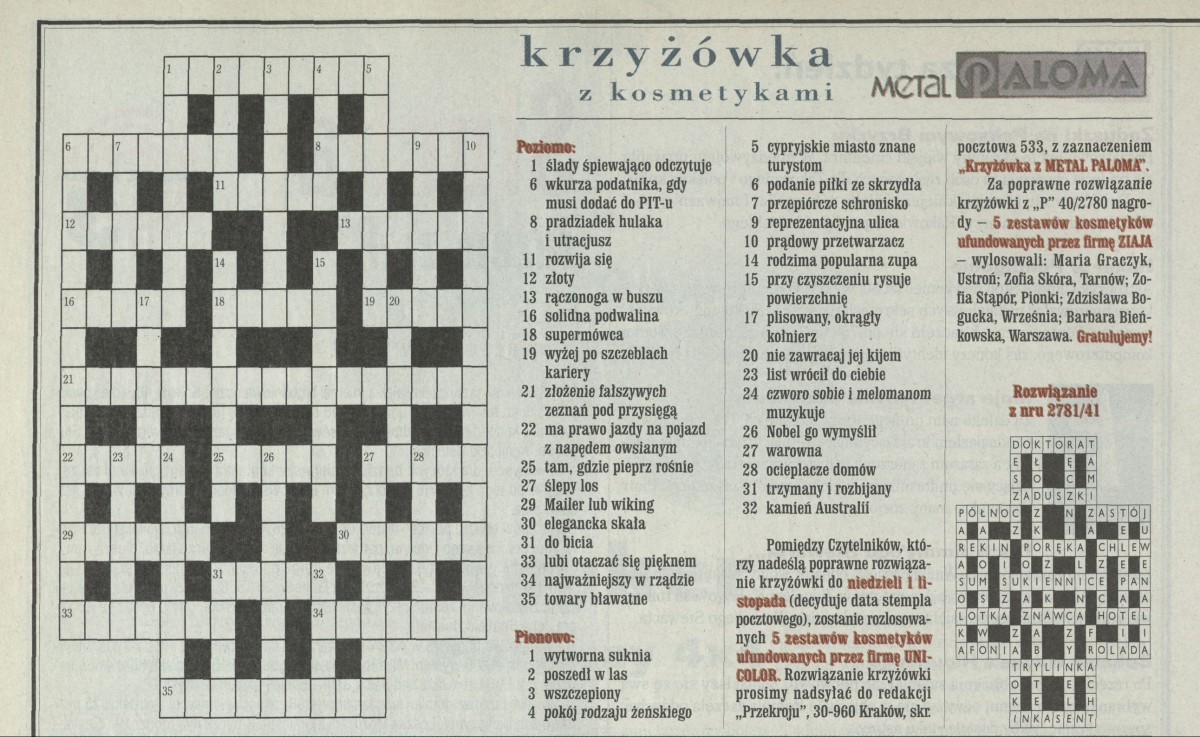 Archiwum / Krzyżówka nr 2783 (27/1998) 120012/123969 Podziel się Tytuł Krzyżówka z kosmetykami Rubryka Krzyżówka Artykuł z numeru 2783 (2784/1998) Data wydania 25 października 1998