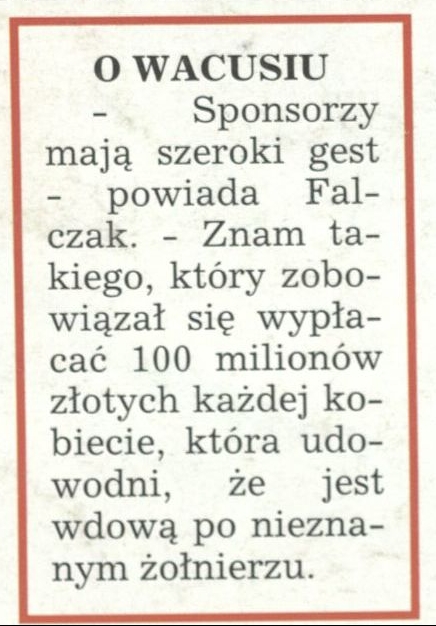 Archiwum / O Wacusiu nr 2588 (05/1995) 88/1181 Podziel się Tytuł O Wacusiu Rubryka O Wacusiu Artykuł z numeru 2588 (5/1995) Data wydania 29 stycznia 1995