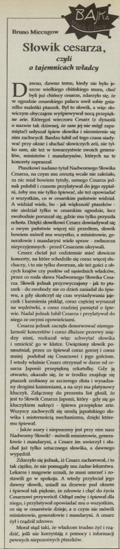 Archiwum / Proza nr specjalny 33/1994 26/38 Podziel się Tytuł Bajka prawdę Ci powie... Słowik cesarza, czyli o tajemnicach władcy Autor Bruno Miecugow Kategoria Proza Artykuł z numeru nr specjalny 33/1994 Data wydania 14 sierpnia 1994 Tagi bajka Słowik cesarza proza