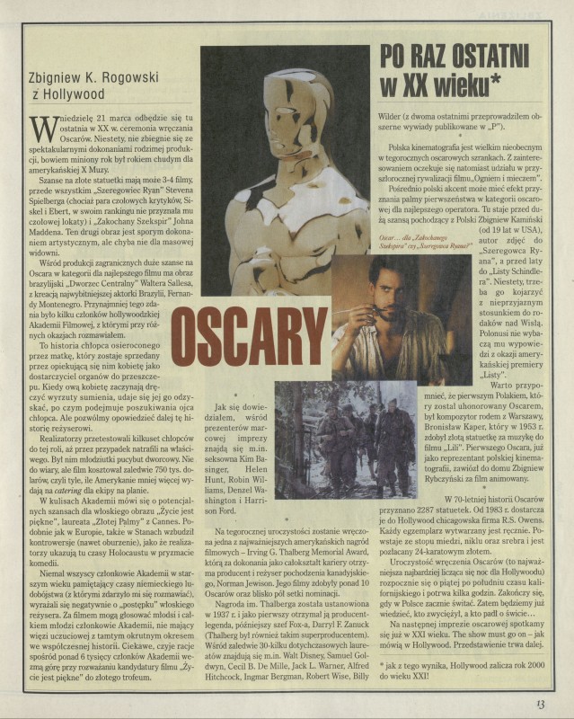 Archiwum / Relacja nr 2804 (28/1999) 07/18 Podziel się Tytuł Oscary Autor Zbigniew K. Rogowski Kategoria Relacja Artykuł z numeru 2804 (2805/1999) Data wydania 21 marca 1999 Tagi ceremonia