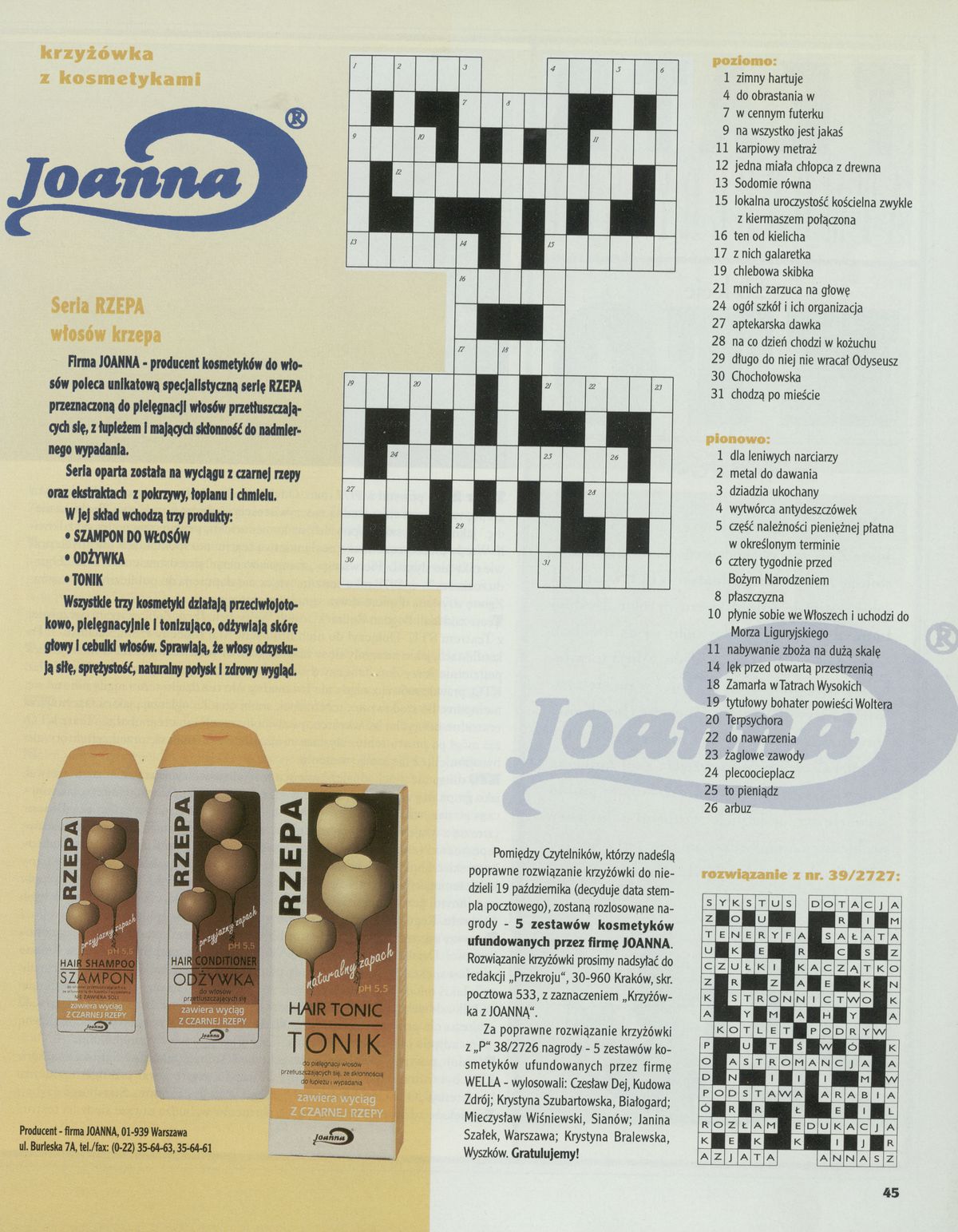 Archiwum / Krzyżówka nr 2729 (41/1997) 117006/123969 Podziel się Tytuł Krzyżówka z kosmetykami Rubryka Krzyżówka Artykuł z numeru 2729 (41/1997) Data wydania 12 października 1997 Tagi Joanna rzepa