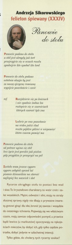 Archiwum / Poezja nr 2728 (40/1997) 153/164 Podziel się Tytuł Panowie do stołu Autor Andrzej Sikorowski Kategoria Poezja Artykuł z numeru 2728 (40/1997) Data wydania 5 października 1997 Tagi felieton spiewany