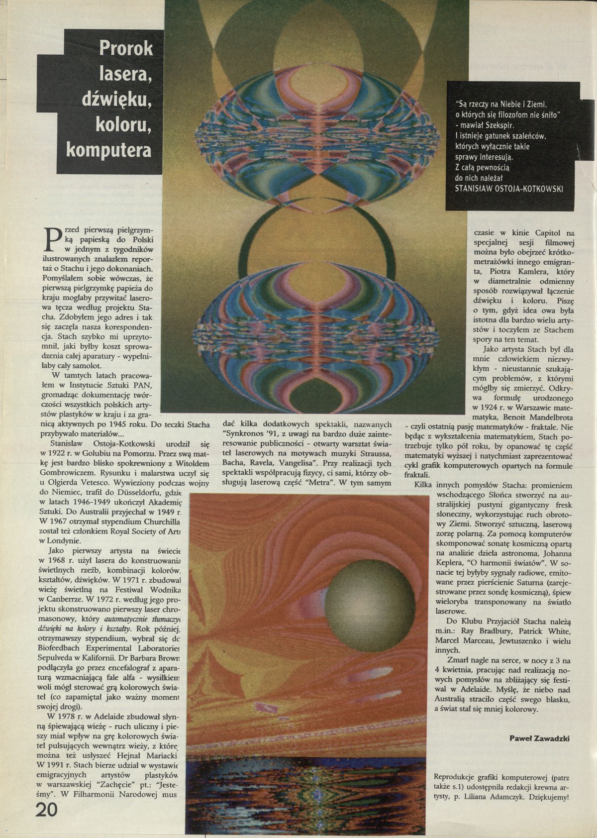 Archiwum / Artykuł nr specjalny 37/1994 2/3 Podziel się Tytuł Prorok lasera, dźwięku, koloru, komputera Autor Paweł Zawadzki Kategoria Artykuł Artykuł z numeru nr specjalny 37/1994 Data wydania 11 września 1994 Tagi Stanisław Ostoja-Kotkowski artysta lasery
