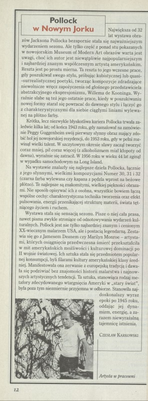 Archiwum / Relacja nr 2799 (28/1999) 31/160 Podziel się Tytuł Pollock w Nowym Jorku Autor Czesław Karkowski Kategoria Relacja Artykuł z numeru 2799 (2800/1999) Data wydania 14 lutego 1999 Tagi Jackson Pollock