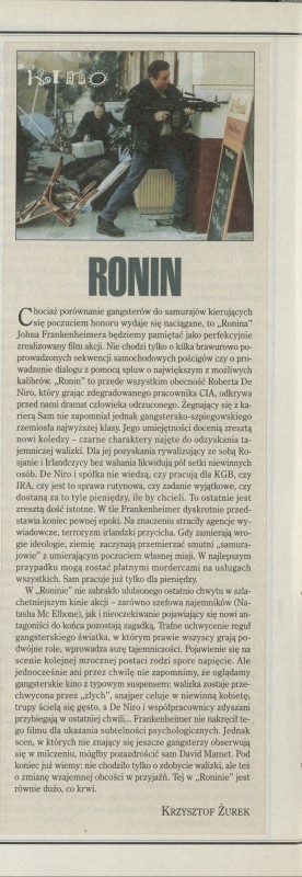 Archiwum / Film nr 2799 (28/1999) 41/104 Podziel się Tytuł Kino: Ronin Autor Krzysztof Żurek Rubryka Film Artykuł z numeru 2799 (2800/1999) Data wydania 14 lutego 1999 Tagi Robert de Niro