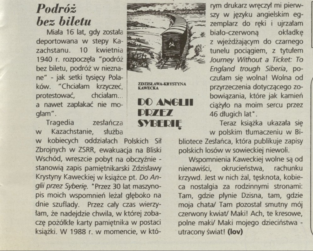 Archiwum / Różności nr 2572 (41/1994) 108245/123969 Podziel się Tytuł Podróż bez biletu Autor Lov Kategoria Różności Artykuł z numeru 2572 (41/1994) Data wydania 9 października 1994 Tagi Zdzisława Krystyna Kawecka Do Anglii przez Syberię