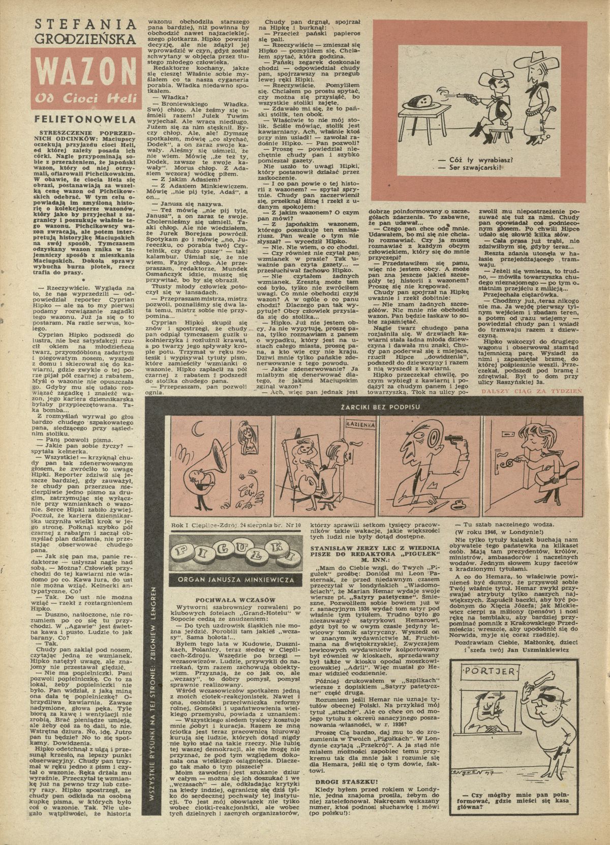 Archiwum / Felieton nr 124 (34/1947) 3612/123969 Podziel się Tytuł Wazon od Cioci Heli Autor Stefania Grodzieńska Kategoria Felieton Artykuł z numeru 124 (34/1947) Data wydania 24 sierpnia 1947 Tagi opowiadanie humor nowela