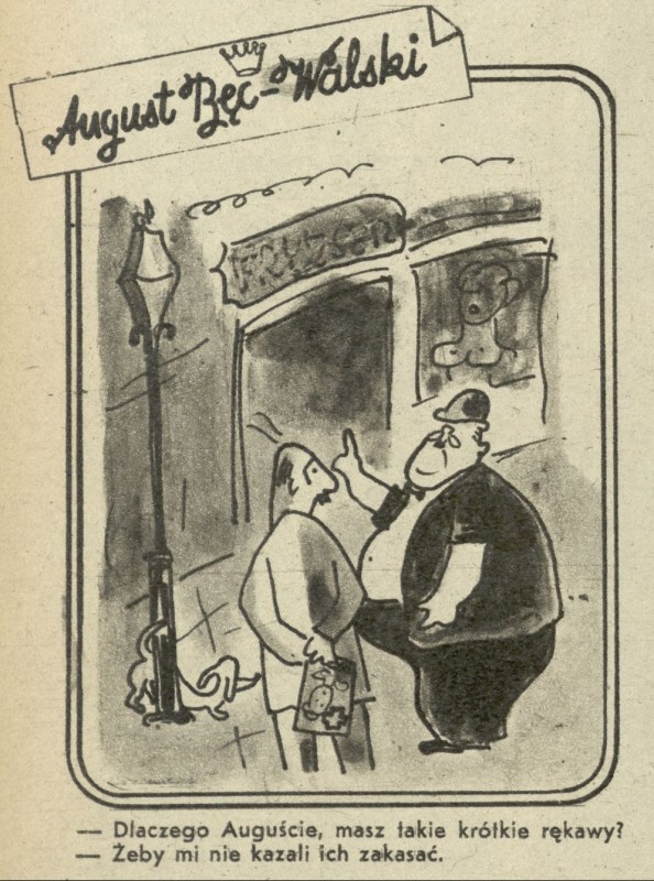 Archiwum / August Bęc-Walski nr 124 (34/1947) 43/239 Podziel się Tytuł - Dlaczego Auguście, masz takie krótki rękawy? Autor Karol "Charlie" Ferster Rubryka August Bęc-Walski Artykuł z numeru 124 (34/1947) Data wydania 24 sierpnia 1947 Tagi rysunek humor dowcip