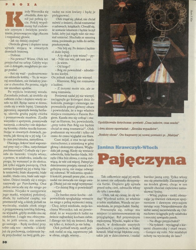 Archiwum / Proza nr 2666 (30/1996) 10398/121061 Podziel się Tytuł Pajęczyna Autor Janina Krawczyk-Włoch Kategoria Proza Artykuł z numeru 2666 (30/1996) Data wydania 28 lipca 1996 Tagi upał