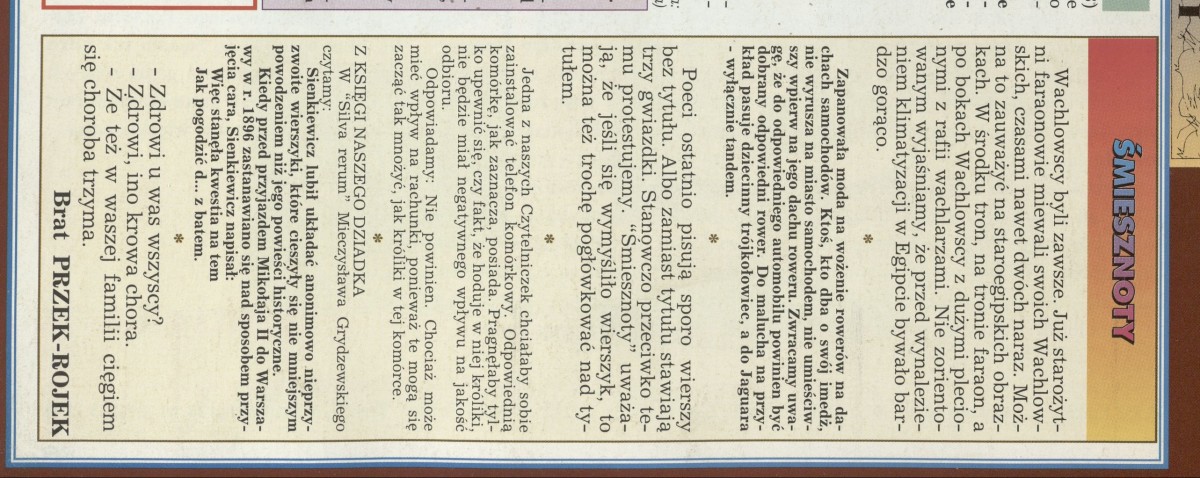 Archiwum / Rozrywka nr 2611 (28/1995) 110498/123969 Podziel się Tytuł Śmiesznoty Autor Brat PRZEK-ROJEK Kategoria Rozrywka Artykuł z numeru 2611 (28/1995) Data wydania 9 lipca 1995 Tagi Śmiesznoty