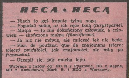 Archiwum / Heca hecą nr 2219-20 (51-52/1987) 92/409 Podziel się Tytuł Heca hecą Rubryka Heca hecą Artykuł z numeru 2219-20 (51/1987) Data wydania 20 grudnia 1987 Tagi powiedzenia powiedzonka