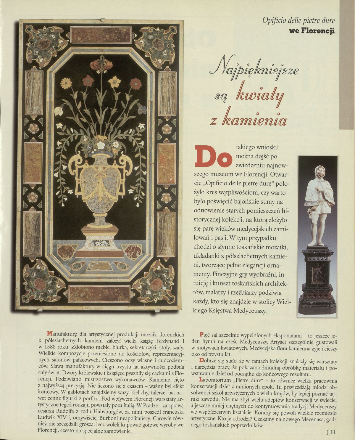Archiwum / Kultura nr specjalny 11/1996 4/4 Podziel się Tytuł Najpiękniejsze są kwiaty z kamienia Autor J.H. Kategoria Kultura Artykuł z numeru nr specjalny 11/1996 Data wydania 17 marca 1996 Tagi mozaika pietra dura kwiaty z kamienia Florencja