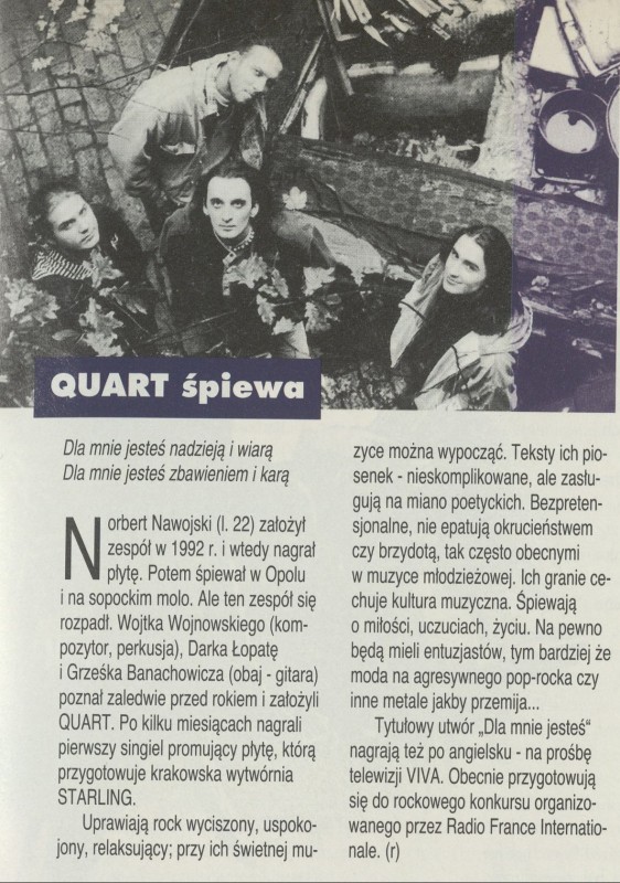 Archiwum / Różności nr specjalny 11/1996 112326/123969 Podziel się Tytuł QUART śpiewa Autor r Kategoria Różności Artykuł z numeru nr specjalny 11/1996 Data wydania 17 marca 1996 Tagi zespół muzyka rock