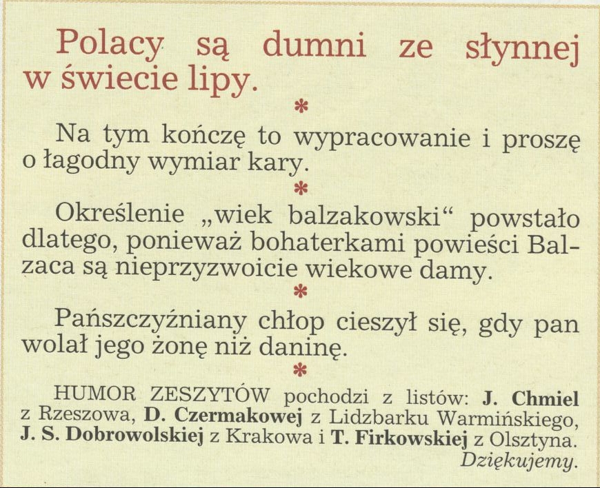 Archiwum / Humor zeszytów szkolnych nr specjalny 11/1996 14/62 Podziel się Tytuł [Polacy są dumni...] Rubryka Humor zeszytów szkolnych Artykuł z numeru nr specjalny 11/1996 Data wydania 17 marca 1996 Tagi humor zeszytów szkolnych rozmaitości
