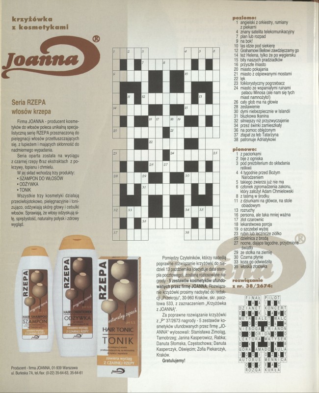 Archiwum / Krzyżówka nr 2676 (40/1996) 113969/123969 Podziel się Tytuł Krzyżówka z kosmetykami Rubryka Krzyżówka Artykuł z numeru 2676 (40/1996) Data wydania 6 października 1996 Tagi rozrywka zdrowa i tania