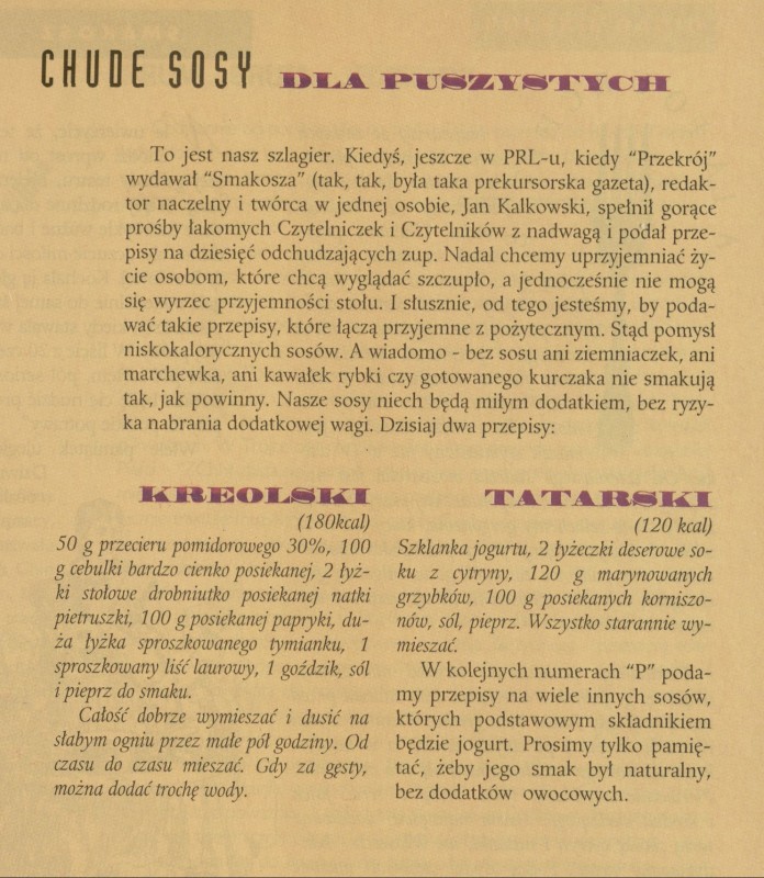 Archiwum / Różności nr 2576 (45/1994) 108450/123969 Podziel się Tytuł Chude sosy dla puszystych Autor Elżbieta Lechowicz Kategoria Różności Artykuł z numeru 2576 (45/1994) Data wydania 6 listopada 1994 Tagi gastronomia kulinaria przepis kulinarny sos kreolski sos tatarski