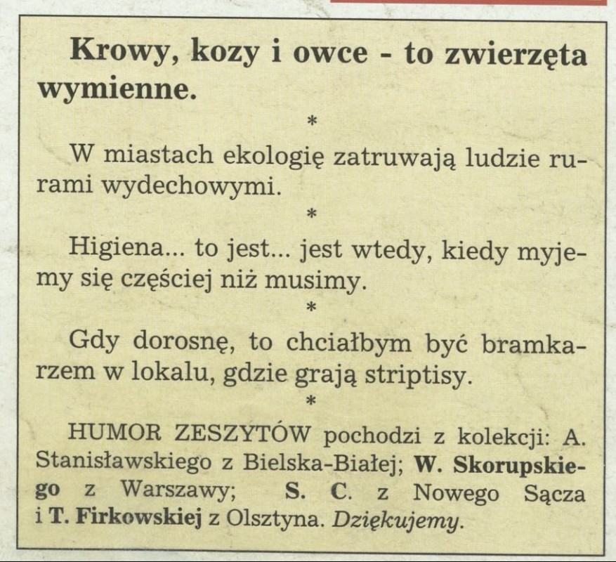Archiwum / Humor zeszytów szkolnych nr 2576 (45/1994) 04/44 Podziel się Tytuł Humor zeszytów Rubryka Humor zeszytów szkolnych Artykuł z numeru 2576 (45/1994) Data wydania 6 listopada 1994