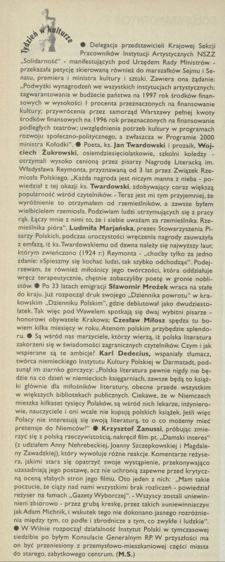 Archiwum / Tydzień w kulturze nr specjalny 18/1996 112719/123969 Podziel się Tytuł Tydzień w kulturze Autor M.S. Rubryka Tydzień w kulturze Artykuł z numeru nr specjalny 18/1996 Data wydania 5 maja 1996 Tagi kultura Krzysztof Zanussi Sławomir Mrożek Jan Twardowski