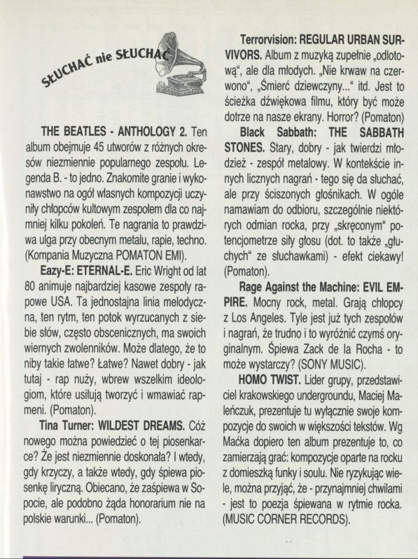 Archiwum / Słuchać albo nie słuchać nr specjalny 18/1996 03/12 Podziel się Tytuł Słuchać nie słuchać Rubryka Słuchać albo nie słuchać Artykuł z numeru nr specjalny 18/1996 Data wydania 5 maja 1996 Tagi recenzje muzyka płyty